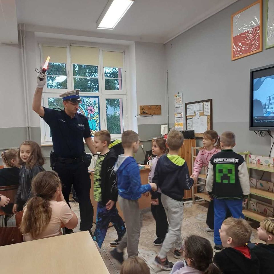 Do szkoły zawitał dzielnicowy, który omówił z uczniami zasady bezpiecznego poruszania się po drogach. W czasie spotkania zwrócono uwagę na obowiązek noszenia elementów odblaskowych, zachowanie ostrożności przy przejściach dla pieszych oraz na to, jak reagować w sytuacjach stwarzających zagrożenie.