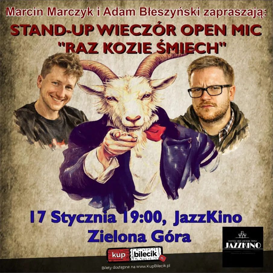 Raz Kozie Śmiech nadchodzi! Nowy rok, nowe żarty, nowe twarze - zaczynamy 2026 tak, jak trzeba! Już 17 stycznia o 19:00 szykujcie się na kolejną porcję stand-upu bez cenzury. Będzie świeżo, ostro i bardzo śmiesznie - wow wow wow, będzie się działo! Wieczór poprowadzą Marcin Marczyk i Adam Błeszyński - gospodarze, którzy doskonale wiedzą, jak rozkręcić publikę i zadbać o klimat.