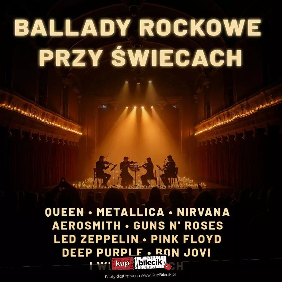 bilety: Poczuj magię największych rockowych hymnów podczas wyjątkowego wieczoru, w którym legendarne melodie ożywają w wykonaniu kwartetu smyczkowego, otulone blaskiem setek świec. Rockowe Ballady w Blasku Świec artyści: Różni wykonawcyPoczuj magię największych rockowych hymnów podczas wyjątkowego wieczoru, w którym legendarne melodie ożywają w wykonaniu kwartetu smyczkowego, otulone blaskiem setek świec. Usłyszysz utwory najbardziej ikonicznych zespołów świata: Queen, Metallica, Nirvana, Aerosmith, Guns N’ Roses, Led Zeppelin, Pink Floyd, Deep Purple, Bon Jovi i wielu innych. Smyczkowe aranżacje nadają tym ponadczasowym klasykom nową, poruszającą głębię. Ciepłe światło świec tworzy niepowtarzalną, intymną atmosferę – czeka Cię niezapomniane muzyczne przeżycie. Bilety do nabycia na: KupBilecik.pl |