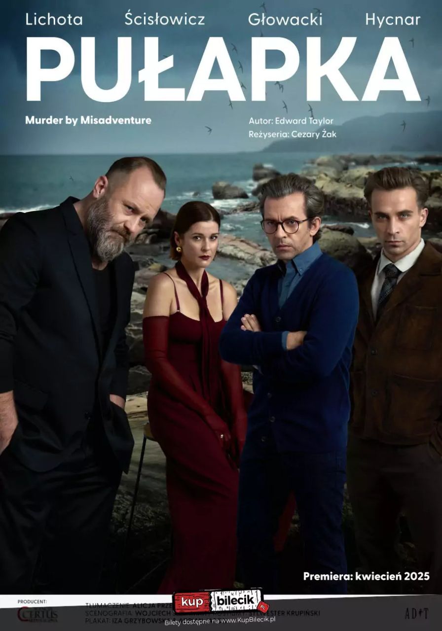 bilety: Pułapka - trzymający w napięciu kryminał Edwarda Taylora, w reżyserii Cezarego Żaka i nowym tłumaczeniu Alicji Przerazińskiej i Adama Kasjaniuka. Pułapka - luksusowy apartament, w nowoczesnym, stojącym na klifie wieżowcu, z widokiem na morze. Architektura domu i jego lokalizacja tworzą niepokojącą atmosferę, są zapowiedzią przyszłych wydarzeń. Pułapka - dwaj pisarze, przyjaciele Harold Kent i Paul Riggs, od dziesięciu lat, wspólnie piszą scenariusze kryminałów telewizyjnych. W momencie gdy Harold chce się uniezależnić ujawnia się istota łączących ich związków. Dla osiągnięcia swoich celów obaj są gotowi na wszystko. Następuje lawina trzymających w napięciu wydarzeń i zwrotów akcji oraz zaskakujący Finał! Pułapka - Marta Ścisłowicz, Piotr Głowacki, Leszek Lichota i Jędrzej Hycnar - znakomici polscy aktorzy tworzą kreacje, dzięki którym całkowicie zanurzamy się w kryminalną intrygę! Bilety do nabycia na: KupBilecik.plPułapka - reż. Cezary Żak artyści: Marta Ścisłowicz, Piotr Głowacki, Leszek Lichota i Jędrzej HycnarPUŁAPKA – trzymający w napięciu kryminał Edwarda Taylora, w reżyserii Cezarego Żaka i nowym tłumaczeniu Alicji Przerazińskiej i Adama Kasjaniuka. PUŁAPKA – luksusowy apartament, w nowoczesnym, stojącym na klifie wieżowcu, z widokiem na morze. Architektura domu i jego lokalizacja tworzą niepokojącą atmosferę, są zapowiedzią przyszłych wydarzeń. PUŁAPKA – dwaj pisarze, przyjaciele Harold Kent i Paul Riggs, od dziesięciu lat, wspólnie piszą scenariusze kryminałów telewizyjnych. W momencie gdy Harold chce się uniezależnić ujawnia się istota łączących ich związków. Dla osiągnięcia swoich celów obaj są gotowi na wszystko. Następuje lawina trzymających w napięciu wydarzeń i zwrotów akcji oraz zaskakujący FINAŁ! Bilety do nabycia na: KupBilecik.pl |